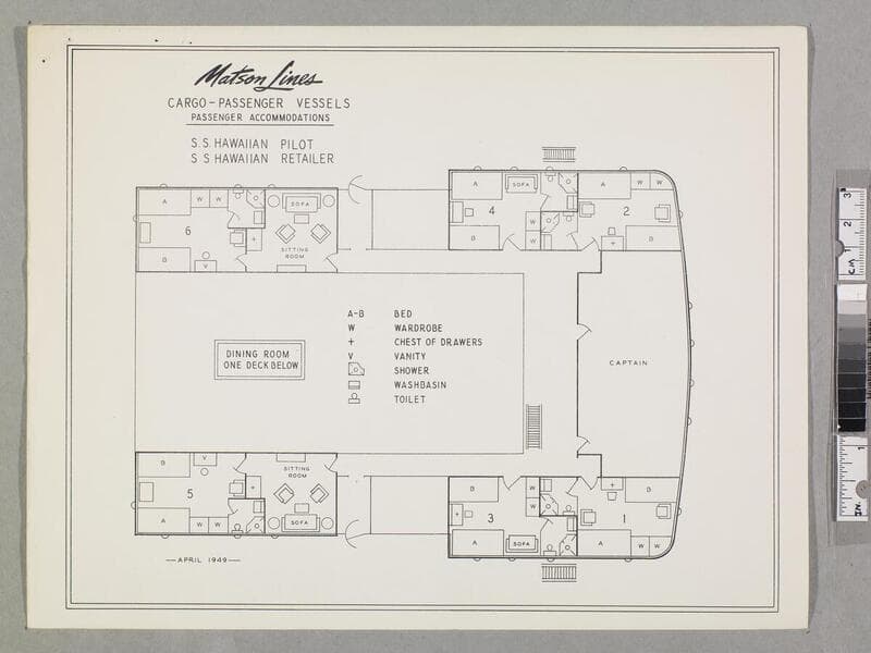 "April 1949"--recto, lower left. "File copy"--ms. inscription, recto, red pencil. Passenger accommodation plans for cargo-passenger vessels. Focus of item: Hawaiian Pilot ; Hawaiian Retailer.
