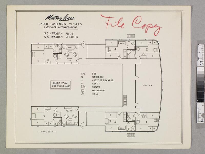 At head of title: Matson Lines. "April 1949"--recto, lower left corner. "File copy"--ms. inscription, recto, red pencil. Deck plans for passenger accommodations onboard the S. S. Hawaiian Wholesaler. Focus of item: Hawaiian Wholesaler.