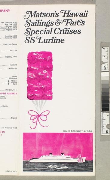 "Lit 1 litho U.S.A. 012345"--printer's note, back cover, bottom, small type. "Issued January 2, 1970"--front cover. "Pomona travel agency... Pomona, Calif."-stamped, blue ink, back cover. "FEB 23 1970"--stamped, blue ink, front cover. Information on Hawaii cruises; including schedules, fares, itineraries, and general information. Focus of item: Lurline.