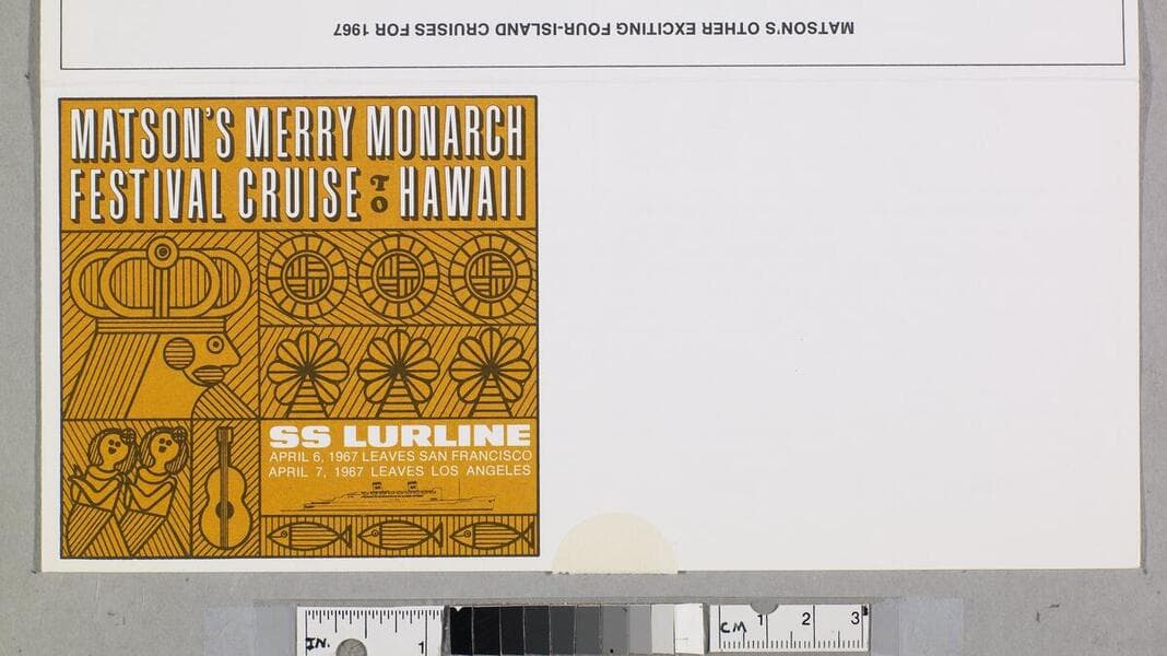 At head of title: Matson Lines. "Lit 102 Litho in U. S. A. 50366"--back cover, bottom. "Pomona travel agency... Pomona, Calif."--back cover, stamped, purple ink. "APR 20 1966"--front cover, stamped, purple ink. Advertisement for special Makahiki cruise to Hawaii; including route map, itinerary, fares, accommodation descriptions, calendar of events, shore excursions, and general information. Focus of item: Lurline.