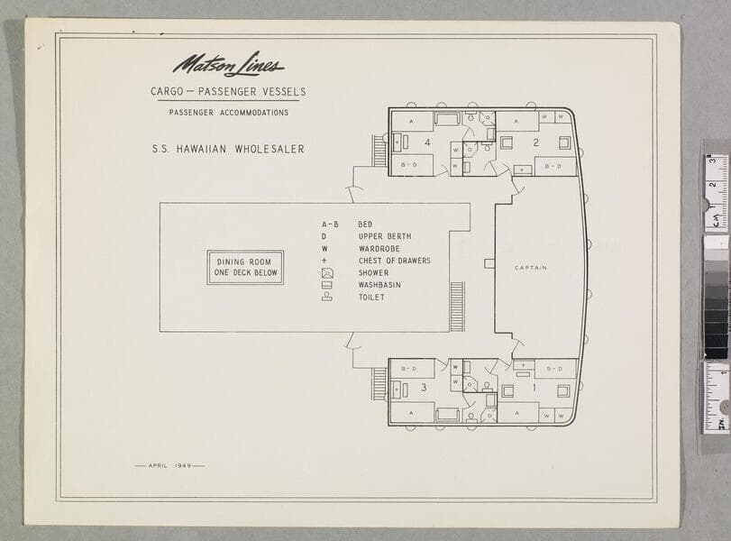 At head of title: Matson Lines. "April 1949"--recto, lower left corner. "File copy"--ms. inscription, recto, red pencil. Deck plans for passenger accommodations onboard the S. S. Hawaiian Wholesaler. Focus of item: Hawaiian Wholesaler.