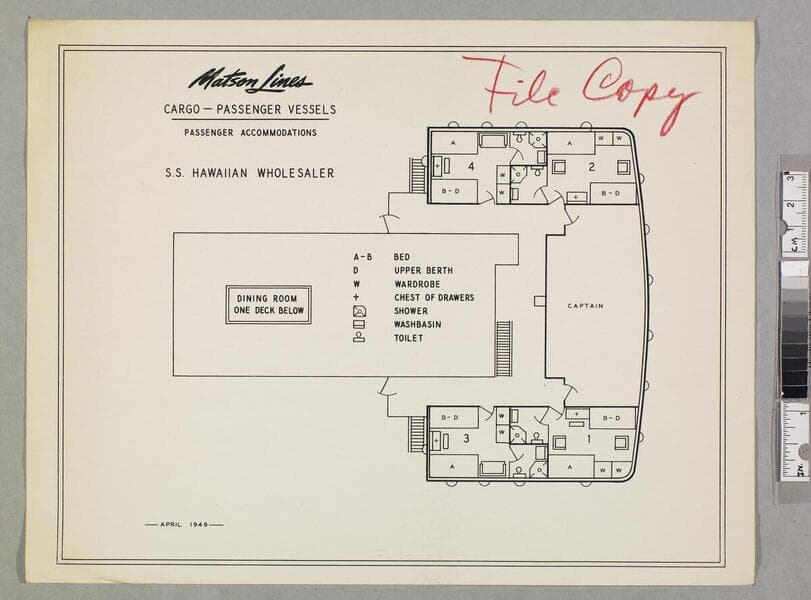 "April 1949"--recto, lower left. "File copy"--ms. inscription, recto, red pencil. Passenger accommodation plans for cargo-passenger vessels. Focus of item: Hawaiian Pilot ; Hawaiian Retailer.