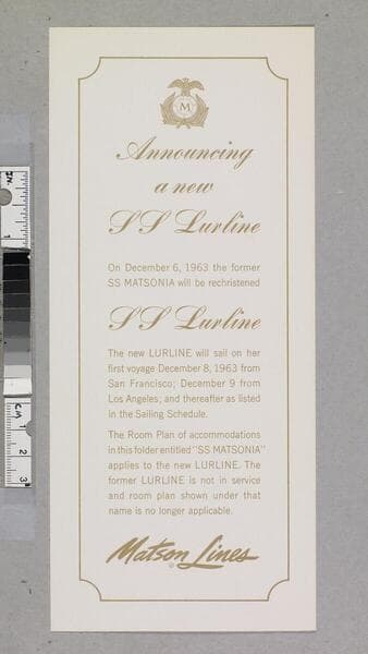 "April 9, 1956"--recto, lower left corner. "Matson SS folder"--ms. inscription in red ink, recto. Advertisement for the new SS Matsonia ; including stateroom and public room descriptions, announcement of booking, and maiden voyage announcement. Focus of item: Matsonia ; Lurline.
