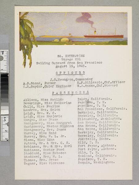 "Sailing from Hilo, Hawaii, July 3, 1925 voyage 229--Hilo to San Francisco"--recto, top. List of passengers and officers for cruise from Hawaii to San Francisco. Focus of item: Enterprise.