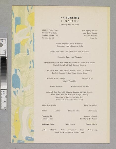 "Friday, July 16, 1948"--recto, below title. Single sheet menu for luncheon onboard S. S. Lurline. Focus of item: Lurline.