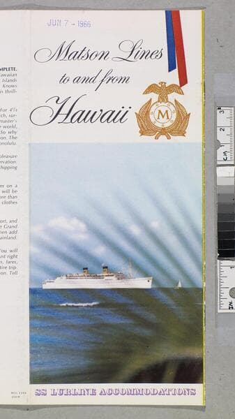 "60M-M-850 printed in U. S. A."--back cover, bottom. "Pomona travel agency... Pomona, California"--back cover, stamped, blue ink. Advertisement for travel to Hawaii onboard the SS Lurline; including accommodation descriptions, floor plans, and vessel amenities. Focus of item: Lurline.