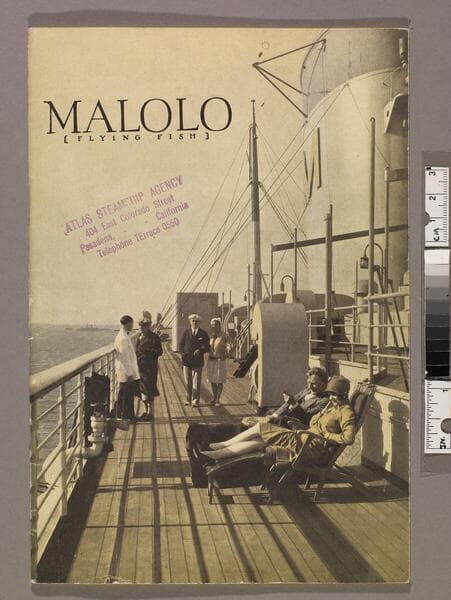 "25M--A321--7-28--I.R.Co" ; "Printed in U. S. A."--p. [28], bottom. "Atlas steamship agency... Pasadena, California"--stamped, purple ink, p. [i], 28, [29], & [30]. An account of Phyllis and Roger Warner's cruise aboard the SS Malolo from San Francisco to Hawaii and back. Focus of item: Malolo.