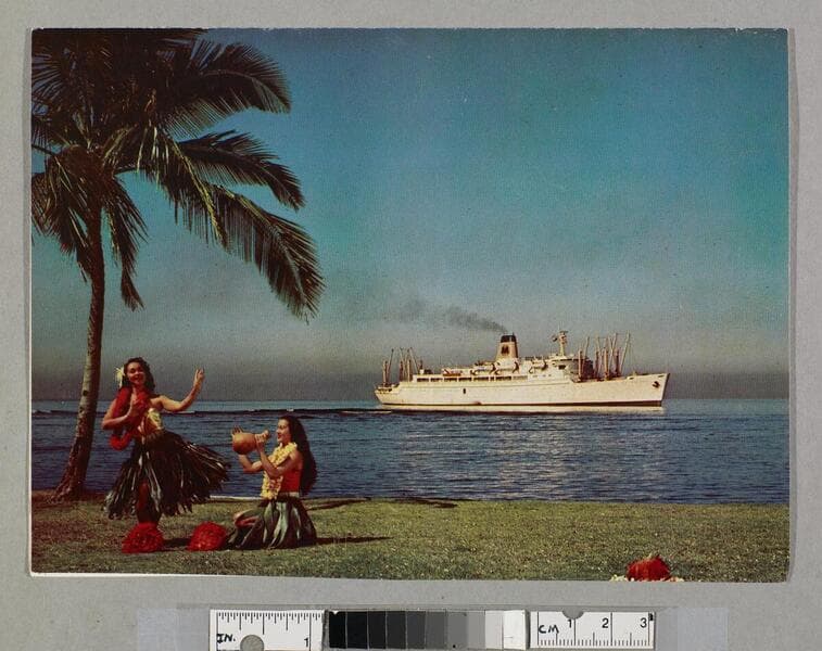 "Lit 95 litho in U. S. A. 012345"--back cover, bottom, small type. Money holder made from card stock, compliments of Matson Lines ; originally held complimentary 20 franc note for purchases at Papeete, Tahiti.