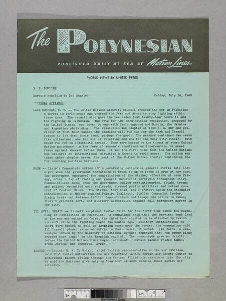 "Enroute Honolulu to Los Angeles Thursday, July 15, 1948"--front cover, below title. "World news by Union Press"--front cover, below title. Periodical of daily news reports typed and released onboard the S. S. Lurline, with daily program of events on back cover. Focus of item: Lulrine.
