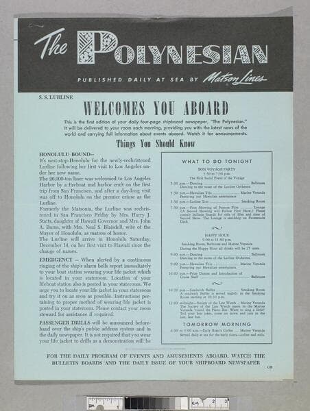 Daily shipboard newsletter ; including list of facilities and services, general information, vessel dimensions and description, illustrated route map, knots to miles conversions, list of officer and crew insignia, and nautical visibility. Focus of item: Mariposa.