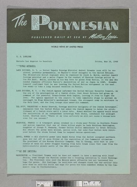 "Enroute Los Angeles to Honolulu Thursday, May 13, 1948"--front cover. "World news by United Press"--front cover, below title. Typed newsletter of daily press reports; including daily program of events on back cover. Focus of item: Lurline.