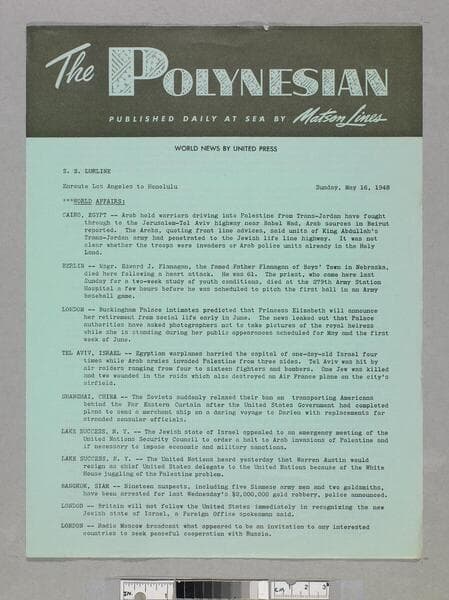 "Enroute Los Angeles to Honolulu Thursday, May 13, 1948"--front cover. "World news by United Press"--front cover, below title. Typed newsletter of daily press reports; including daily program of events on back cover. Focus of item: Lurline.