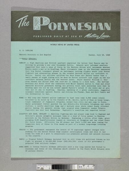 "Enroute Honolulu to Los Angeles Saturday, July 17, 1948"--front cover, below title. "World news by Union Press"--front cover, below title. Periodical of daily news reports typed and released onboard the S. S. Lurline, with daily program of events on back cover. Focus of item: Lurline.
