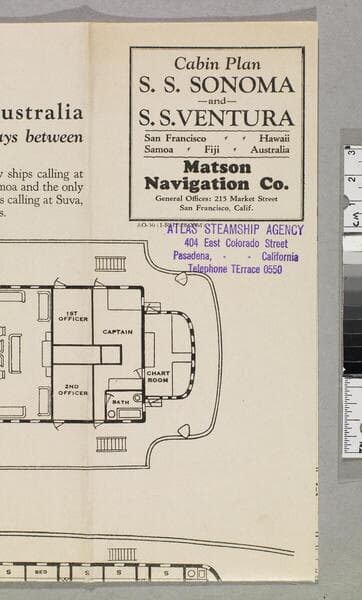 "O.S.S. 100--5M 6-21"--printer's note, top left corner, recto, small type. At head of title: Oceanic S. S. Co. : Sydney Short Line. "Steamship tickets sold to all points W. R. Flynn, Agt. Santa Fe R. R."--stamped, blue ink, verso, bottom. Deck plans for the S.S. Sonoma and the S.S. Ventura with advertisement for Sydney Short Line service. Focus of item: Sonoma ; Ventura.