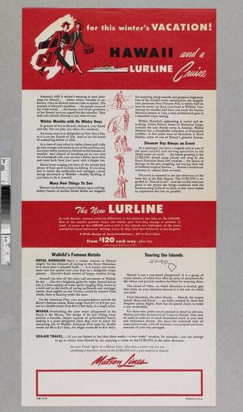 "(40M-658) Lit. 5"--back cover, lower left corner, small type. "JUL 3 1958" ; "Pomona travel agency... Pasadena, Calif."--stamped, blue ink, back cover. Advertisement of Hawaiian cruises; including island descriptions, Waikiki hotel information, vacation itineraries and fares. Focus of item: Lurline ; Matsonia.
