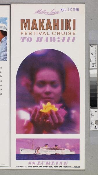 "Lit. 101 250M 265 Litho in U. S. A."--back cover, bottom. "Pomona travel agency... Pomona, Calif."--back cover, stamped, blue ink. Advertisement for Makahiki Hawaii cruise; including route map, island descriptions, itinerary, fares, and advertisement for other special four-island cruises. Focus of item: Lurline.