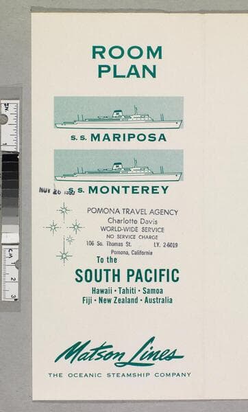 "(45M -- 1155) Litho in U. S. A."--recto, below title. "Pomona travel agency... Pomona, California"--recto, upper left, stamped, black ink. "MAR 10 1956"--recto, upper left, stamped, black ink. Deck plans for the S. S. Mariposa and S. S. Monterey. Focus of item: Mariposa ; Monterey.