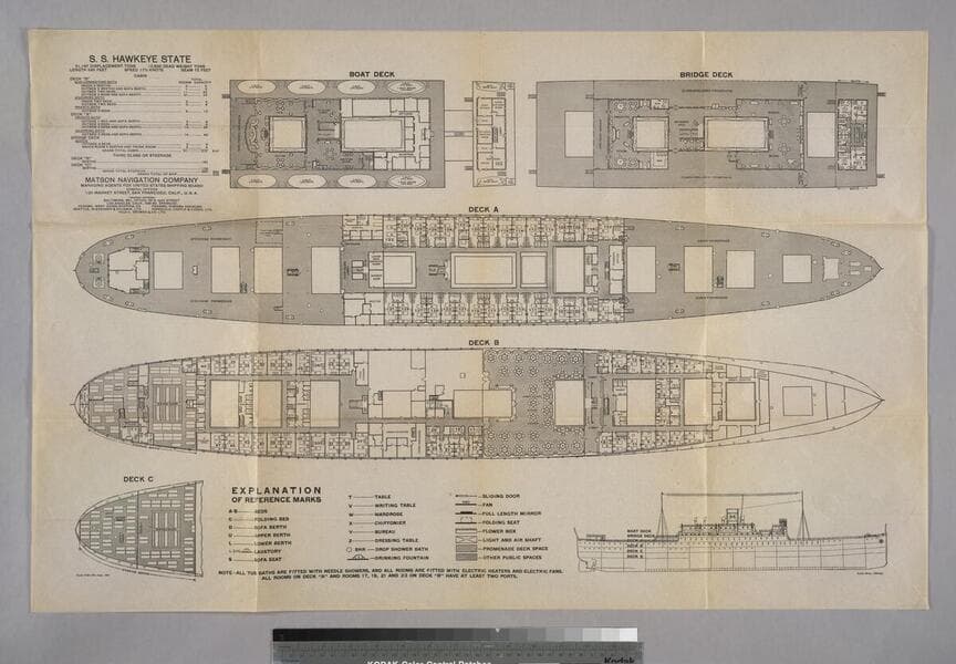 "The Union Lithograph Co., S. F. advertising service"--recto, lower left corner. "Matsonia"--ms. inscription in blue ink, recto, upper right corner. Deck plans for SS Matsonia. Focus of item: Matsonia.