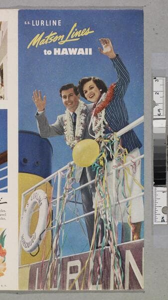 "60M-M-850 printed in U. S. A."--back cover, bottom. "Pomona travel agency... Pomona, California"--back cover, stamped, blue ink. Advertisement for travel to Hawaii onboard the SS Lurline; including accommodation descriptions, floor plans, and vessel amenities. Focus of item: Lurline.