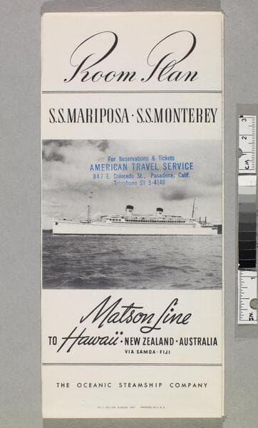 "OX-94 355--11M--1236 / Printed in U. S. A."--back cover, bottom. "For reservations & tickets American travel service 847 E. Colorado St., Pasadena, Calif. Telephone COlorado 7359"--front cover, p. [1] and back cover; stamped in blue ink. "TE 4148"--front cover, back cover; stamped in blue ink; correction to telephone code on stamp mark. Deck plans for S. S. Monterey and S. S. Mariposa; including route map and shipboard images. Focus of item: Mariposa ; Monterey.