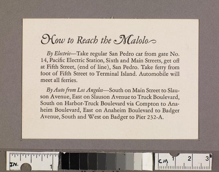 "A-216 (HSC-5-27-10M)"--back cover, lower left corner. Advertisement for maiden voyage of the S. S. Malolo ; including route map, itinerary, trip description, and fares. Focus of item: Malolo.