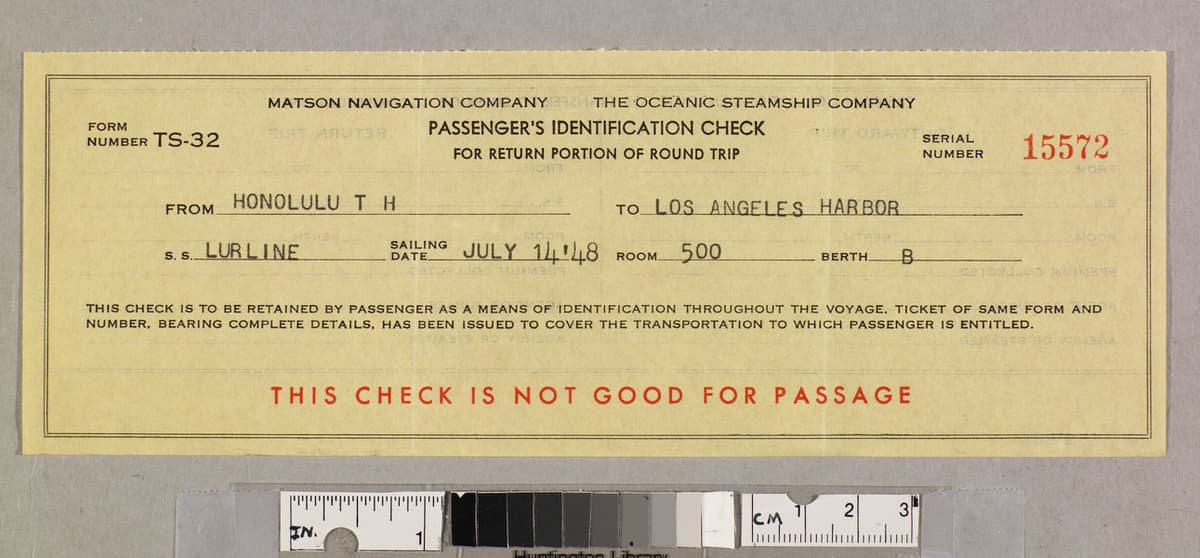 "Form number TS-63 (25M 54447-947)"--printer's note, recto. "482"--ms. inscription in black ink, recto. "Lurline 16-21 July 1948 Honolulu - Los Angeles"--ms. inscription in pencil, verso. Ticket stub for deck chair rental onboard the SS Lurline. Focus of item: Lurline.