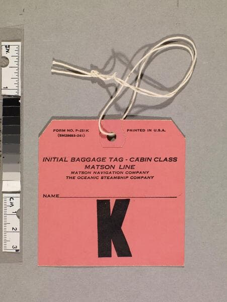 "P-44A (135M 31049-641)"--recto, top. "Printed in U. S. A."--recto, left edge. "J. H. Kemble... [Room] 402... [Destination] Honolulu"--ms. inscription in blue ink, recto. Baggage tag with string for S. S. Lurline service to Hawaii, New Zealand, and Australia. Focus of item: Lurline.