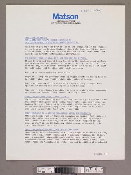 "Lit 245 Litho in U.S.A. 870-50"--printer's note, back cover, bottom, small type. "Cruise fares effective after July 10, 1970"--back cover. "Pomona travel agency... Pomona, Calif."--stamped, blue ink, back cover. "SEP 21 1970"--stamped, blue ink, front cover. Advertisement of holiday cruises; including destinations, itineraries, duration, fares, sail dates, and general information. Focus of item: Mariposa ; Monterey.