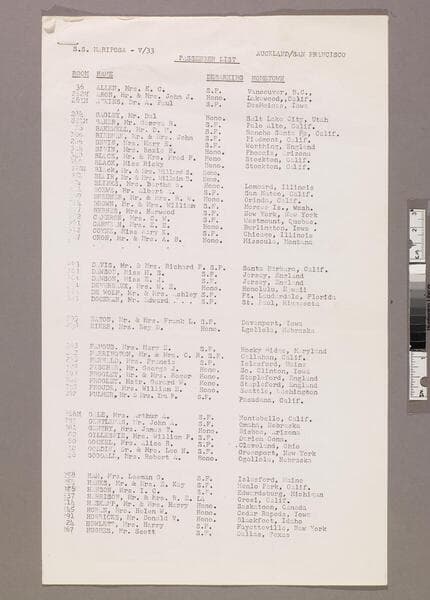 Pagination counts for rectos only, all versos are blank. Pages are stapled together. Ms. inscriptions in pencil throughout. "SS Mariposa - voyage 33 - January 1/2, 1961 San Francisco/Los Angeles harbor"--p. [1], top. Passenger list with embarkment location, room number, name, debarkation location, and hometown. Focus of item: Mariposa.