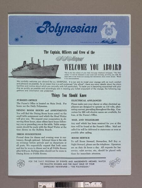 Daily onboard newsletter with welcoming information, passenger regulations, route map, ship facts, miles-knots conversion, and list of the evenings events. Focus of item: Lurline.