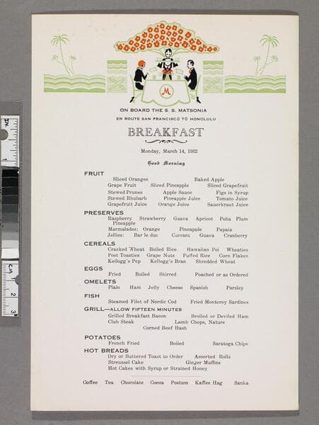 "Monday, March 14, 1932"--recto, below title. Luncheon menu with detachable postcard. Focus of item: Matsonia.