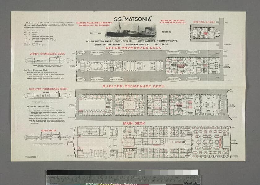 "The Union Lithograph Co., S. F. advertising service"--recto, lower left corner. "Matsonia"--ms. inscription in blue ink, recto, upper right corner. Deck plans for SS Matsonia. Focus of item: Matsonia.