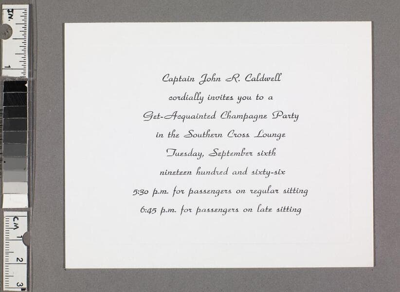 Captain's invitation to farewell party in the Southern Cross Lounge with times for both regular sitting and late sitting passengers.
