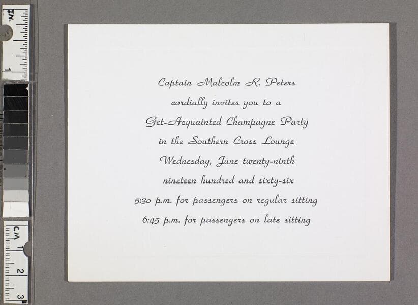 Captain's invitation to welcoming party in the Southern Cross Lounge with times for both regular sitting and late sitting passengers.