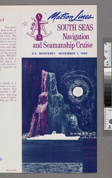 "Lit 228 printed in U. S. A. DR-362-200M"--back cover, bottom. "Pomona travel agency... Pomona, Calif."--back cover, stamped, blue ink. "JUN 5 1962"--front cover, stamped, blue ink. Advertisement for navigation and steamship cruise to the South Pacific ; including cruise description, captain's biographical information, room descriptions, and fares. Focus of item: Monterey.
