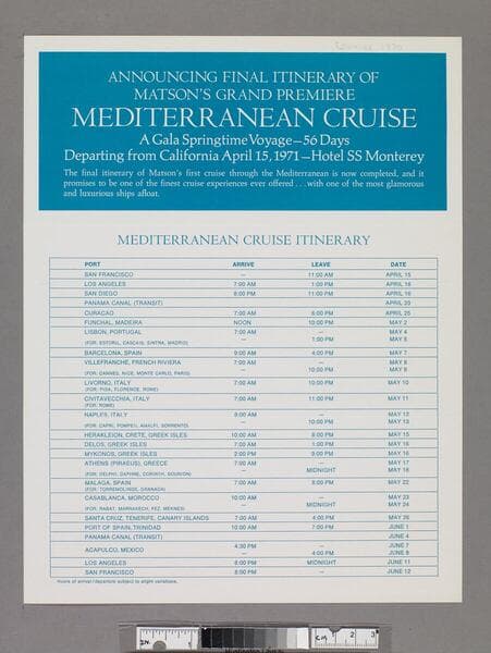 Announcing final itinerary of Matson's grand premiere Mediterranean cruise