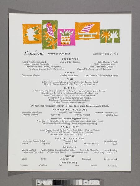 "Tuesday, June 28, 1966"--recto, upper right. Shipboard luncheon menu. Focus of item: Monterey.