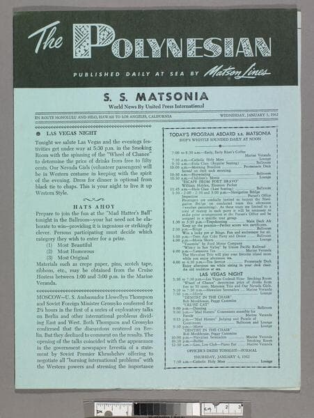 "Monday, January 1, 1962"--front cover, right center. Daily newsletter printed on board SS Matsonia ; including U. S. news, shipboard news, daily program, list of cruise's special events, and general information. Focus of item: Matsonia.