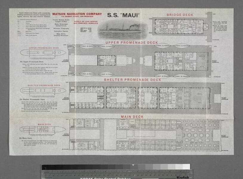 "The Union Lithograph Co., S. F. advertising service"--recto, lower left corner. "Matsonia"--ms. inscription in blue ink, recto, upper right corner. Deck plans for SS Matsonia. Focus of item: Matsonia.