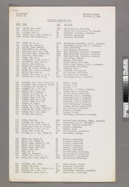 "June 27, 1966"--p. [1], upper right corner. List of passengers, their room numbers, point of debarkation, and hometown for voyage 73 departing Los Angeles on the SS Monterey. Focus of item: Monterey.