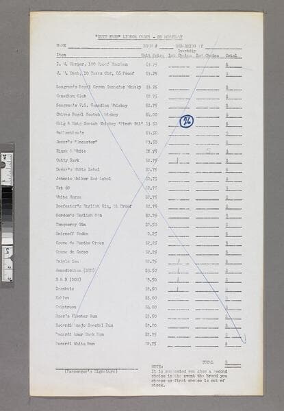 Ms. inscriptions in blue ink, recto. Ms. inscriptions in pencil, verso. Order form for duty free liquor filled out by John H. Kemble, heading for San Francisco. Focus of item: Monterey.