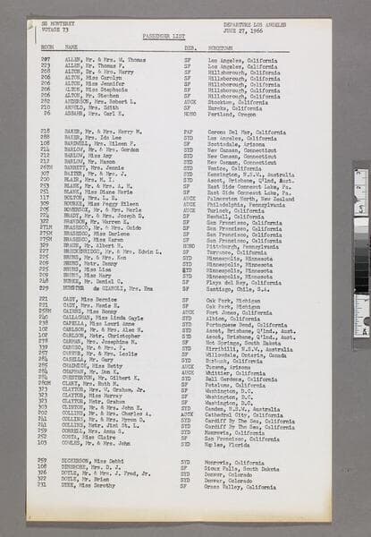 "July 9, 1966"--p. [1], upper right corner. List of passengers, their room numbers, debarkation location, and hometown for voyage 73 departing Rarotonga, Cook Islands on the SS Monterey. Focus of item: Monterey.