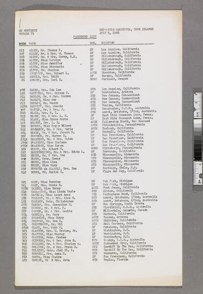 Versos not counted in pagination. "September 5, 1966"--p. [1], upper right corner. List of passengers, their room numbers, debarkation location, and hometown for voyage 74 departing Sydney on the SS Monterey. Focus of item: Monterey.