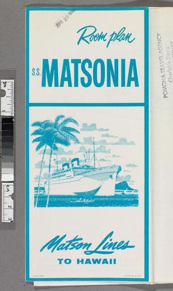 "Lit 3 (50M358-659) litho in U. S. A."--back cover, bottom. "Pomona travel agency... Pomona, Calif." ; "AUG 20 1959"--back cover, stamped, purple ink. "Office copy"--stamped, blue ink, front cover, back cover, and p. [2]. "Office copy"--ms. inscription, blue ink, front cover and back cover. Ms. inscription on p. [5]. Deck plans for the S. S. Matsonia ; including vessel description, deck and room images, and room descriptions. Focus of item: Matsonia.