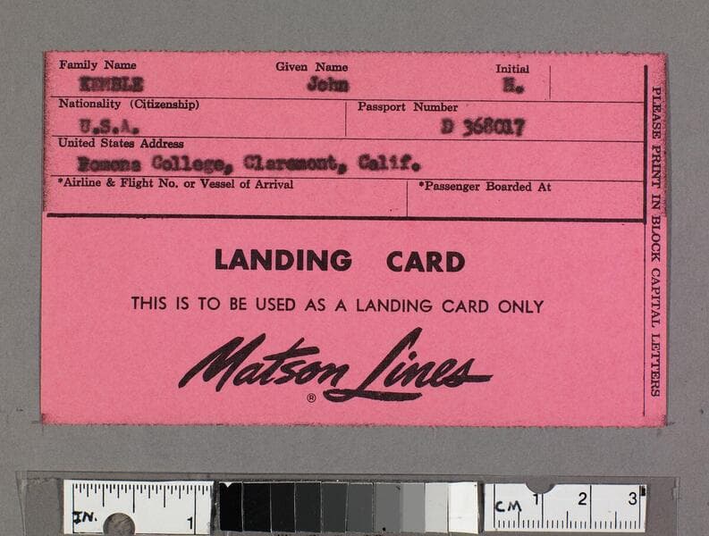 "Mr John H Kemble Pomona College Claremont CA"--typed address label, recto. "[1969]"--ms. inscription in pencil, recto. Blank form for requesting cruise information brochures from Matson Navigation. Focus of item: Lurline ; Mariposa ; Monterey.