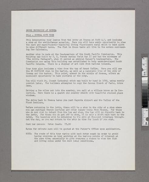 Page count excludes versos. Stapled. Ms. inscription in black ink: Distributed 29 June 1966. Three typed sheets listing shore excursions at Bora Bora and Papeete, Tahiti. Focus of item: Monterey.