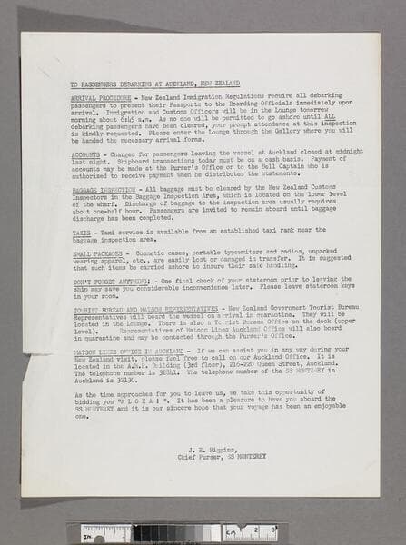 To passengers debarking at Auckland, New Zealand