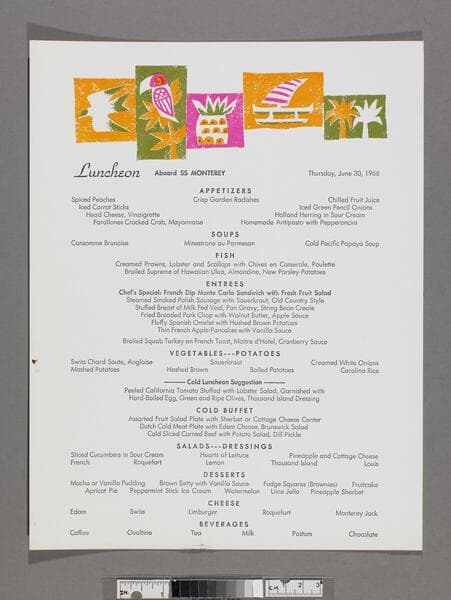 Shipboard luncheon menu for cruise aboard SS Monterey. Focus of item: Monterey.