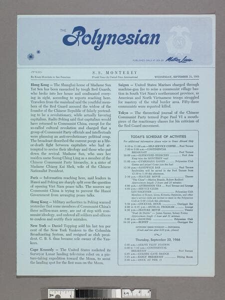 "World news by United Press International"--front cover, below title. Daily onboard newsletter with press releases, list of activities, shipboard news, arrival information, and insert "About Honolulu." Focus of item: Monterey.