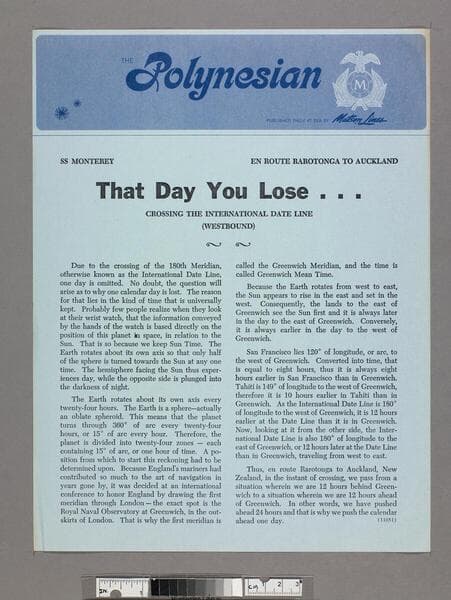 Informational insert about New Zealand for the shipboard newsletter "The Polynesian." Focus of item: Monterey.